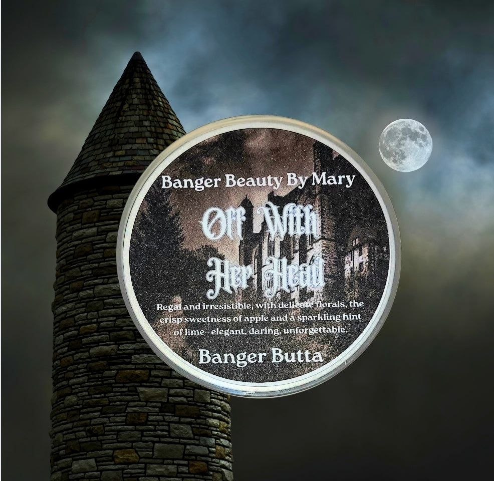 Step into the intrigue of royal courts with Off With Her Head. This luscious, ultra-moisturizing Banger Butta envelops your skin in velvety jasmine, delicate lily, and soft violet, kissed with juicy apple and a hint of sparkling lime. Regal, daring, and unforgettable—wear the scent of a queen whose story ended too soon. Inspired by Anne Bolyn.
